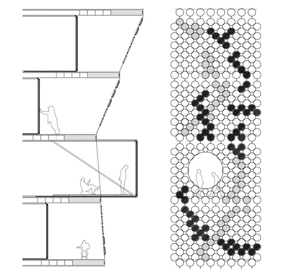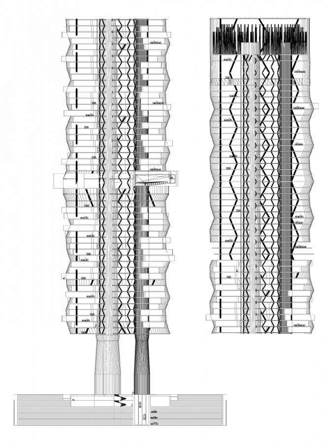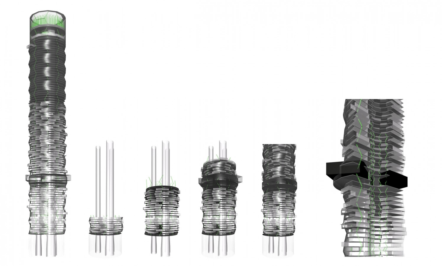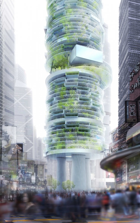 Like a tree, this building aims to be self-sufficient producing its own energy using sun and wind power. The tower is design according to the principles of sustainability in terms of both its shape and its use of materials and renewable energy. The quasi-cylindered shape offers less wind resistance and the circular floors are radially shifted in six different positions to allow better lighting at each level. A metallic framework skin, integrating vegetal elements and solar modules placed according to aspect and latitude, offers a wind and solar protection. images © Jean-François Marcheguet Artefactorylab