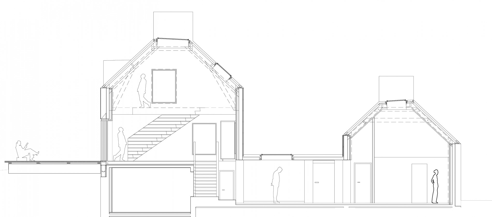 The two spaces developed under the sloping roof, illuminated by skylights, are connected by a low volume characterized by zenith light. The continuity and breadth of this area give life to this project.