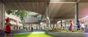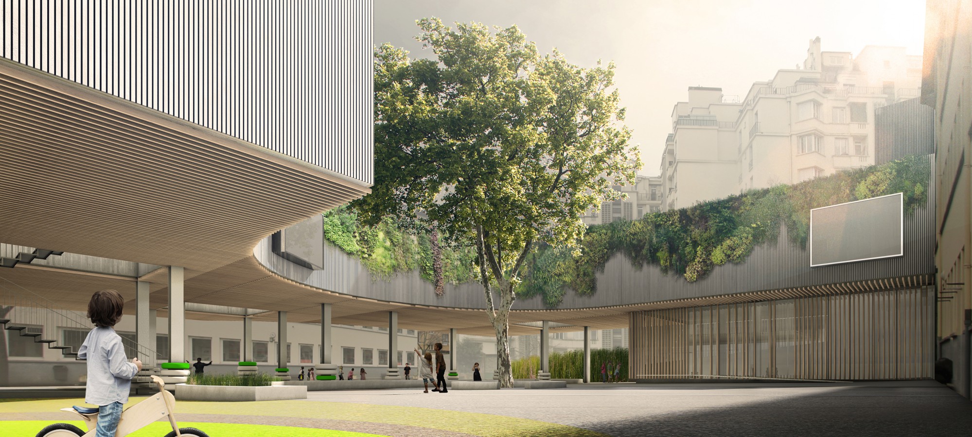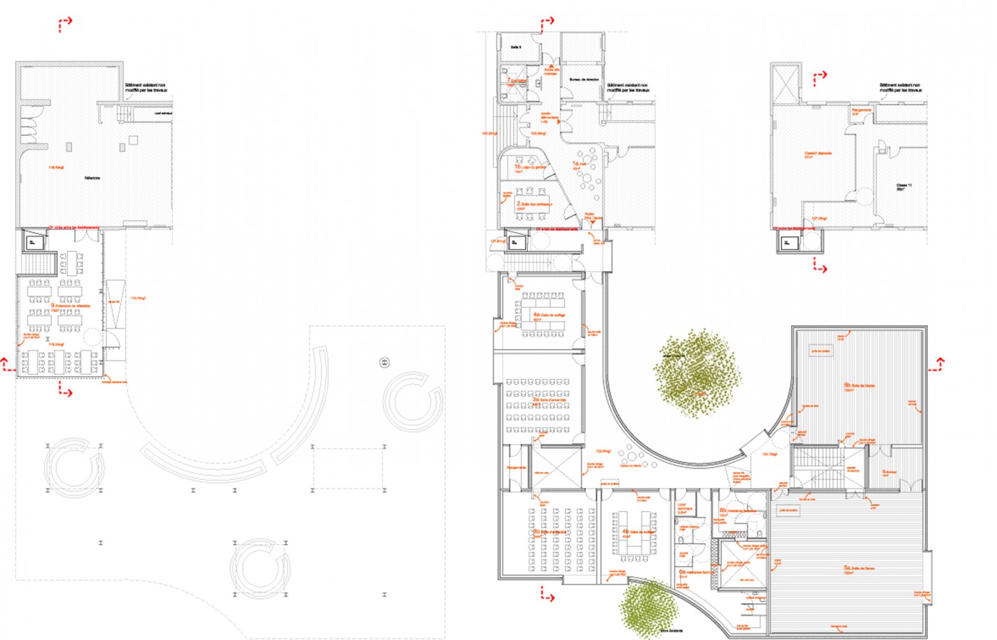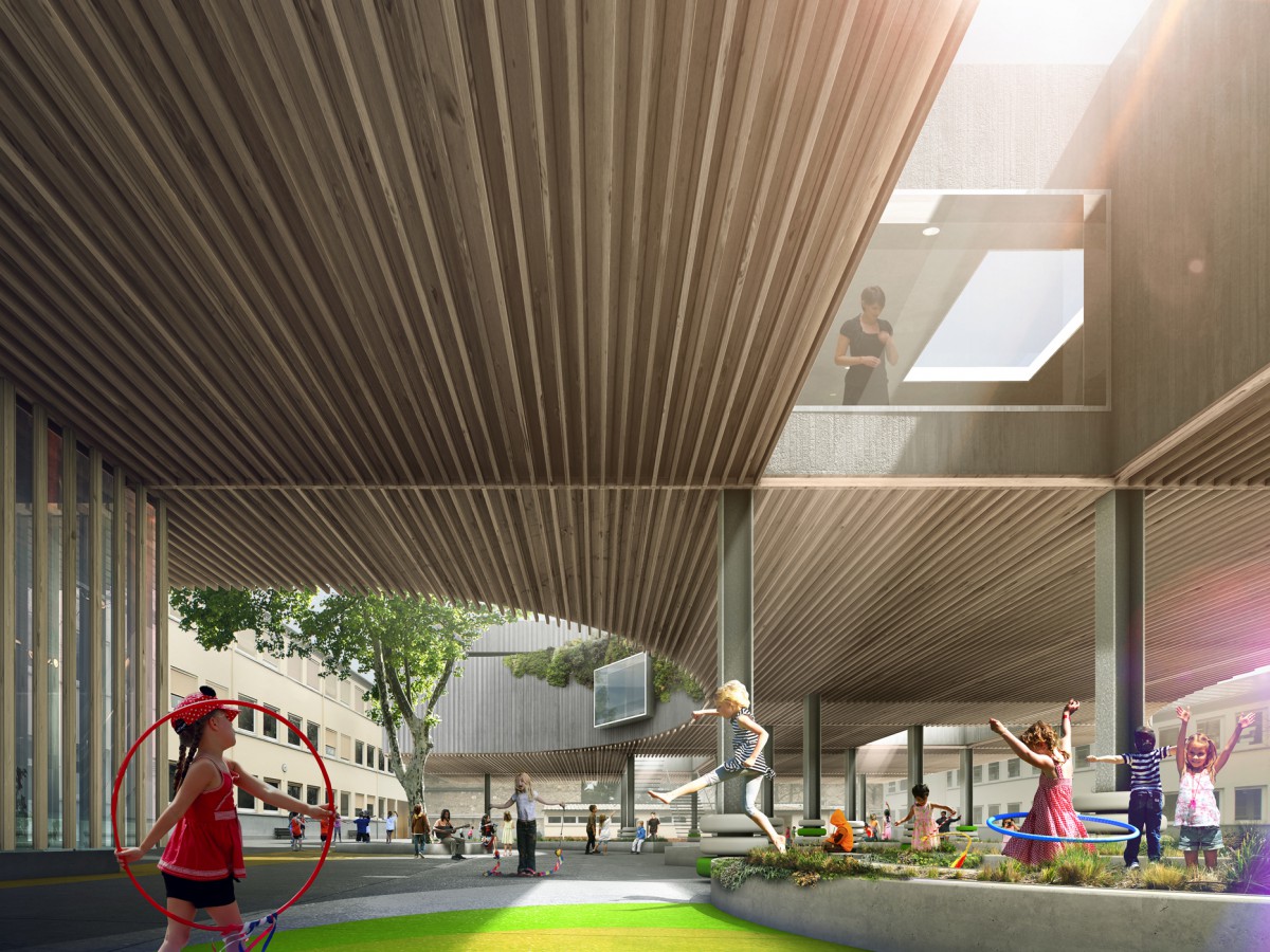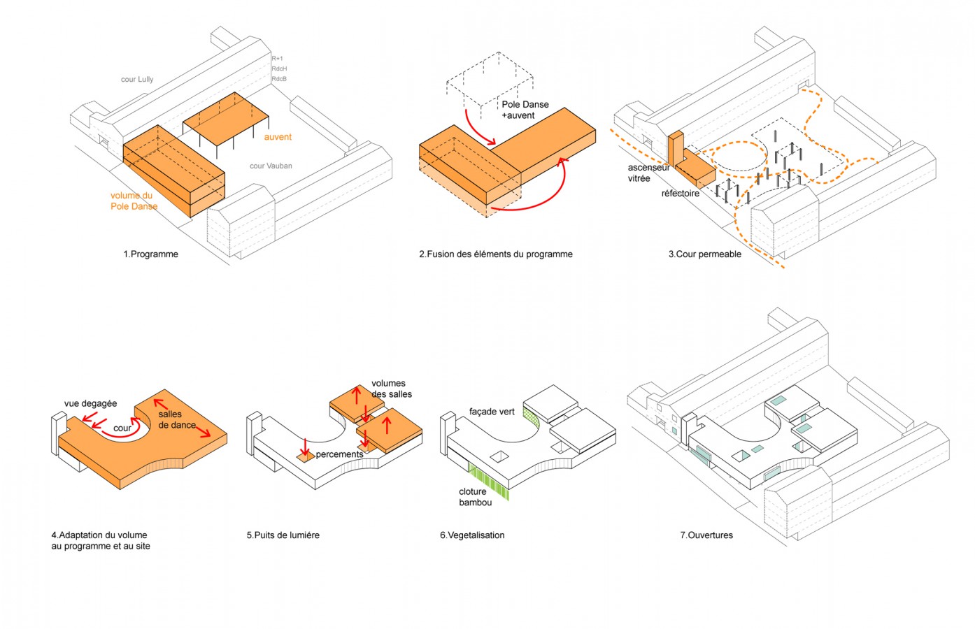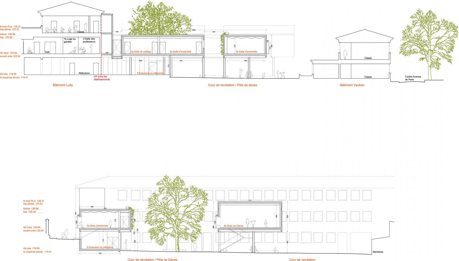 Project site is the courtyard of Lully-Vauban school in Versailles. The program ask for 1.an extension of the Dance Center accessible from the hall in high ground level of the existing school, 2.extension of the school canteen, in lower ground floor, providing natural illumination, 3. a canopy for students break. We decided to weld the elements together by 1.a floating building organizing the Dance Center on the same level, 2.a glass box below, 3. a wide covered space crossing the courtyard. The free height of the garden varies between 360 and 410cm, following the altimetry of the courtyard; building is 770cm high, reaching the 900cm for the dance-halls.