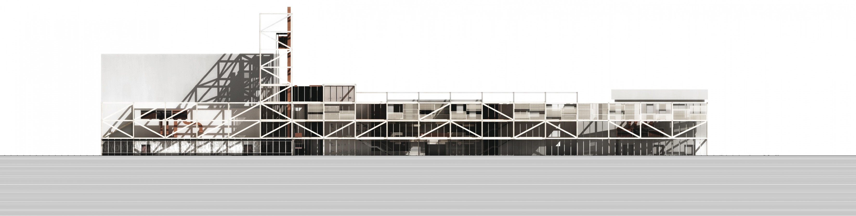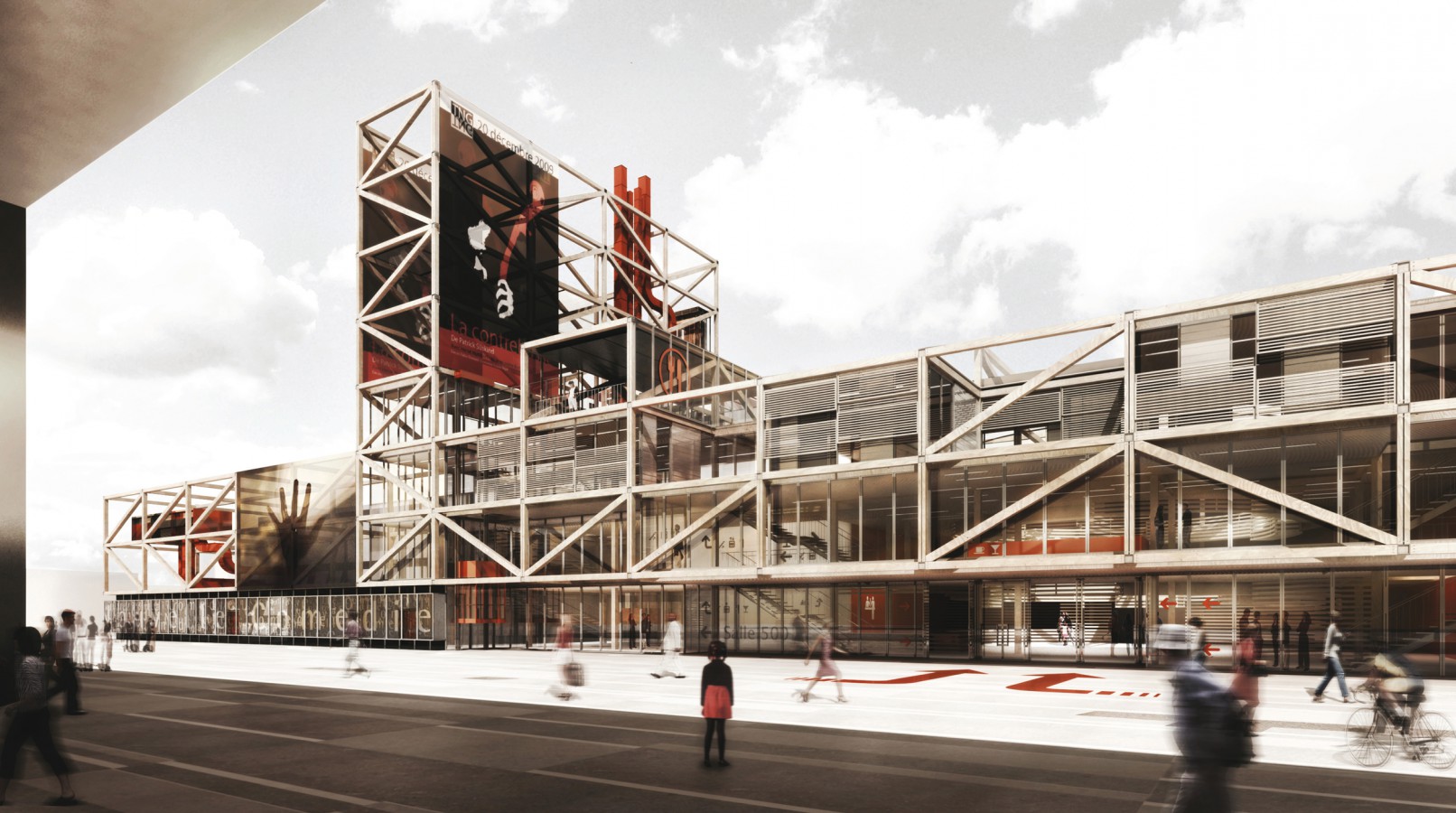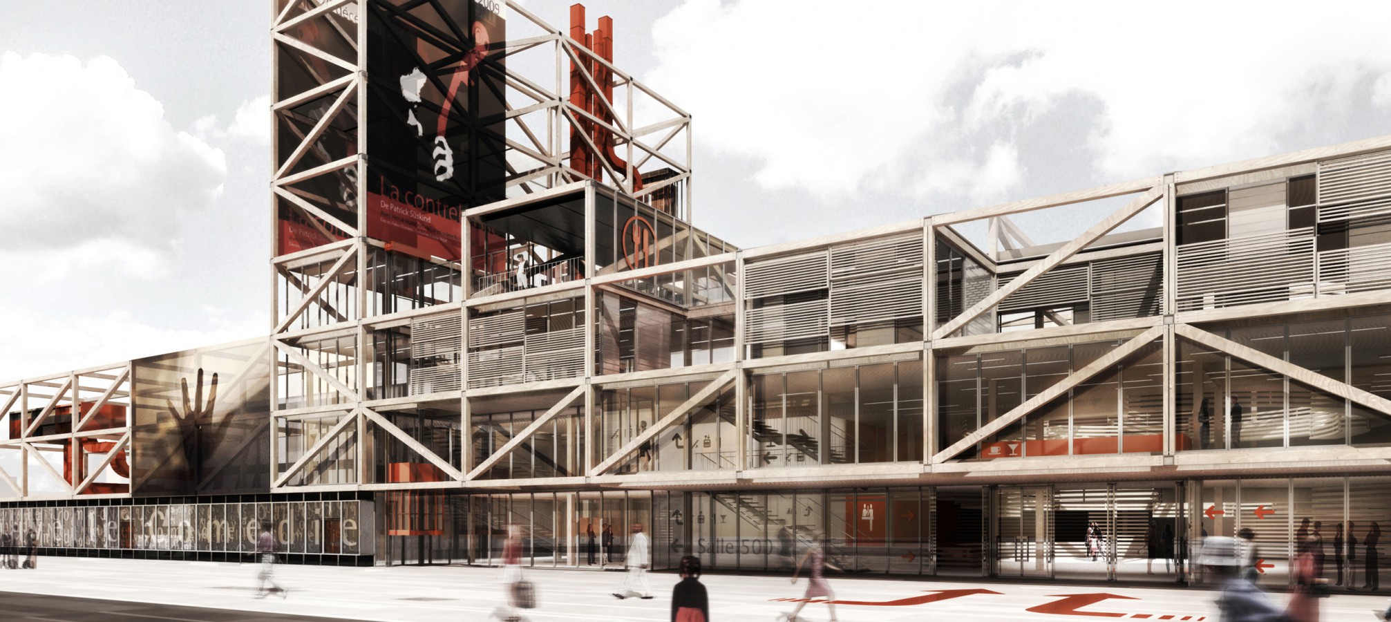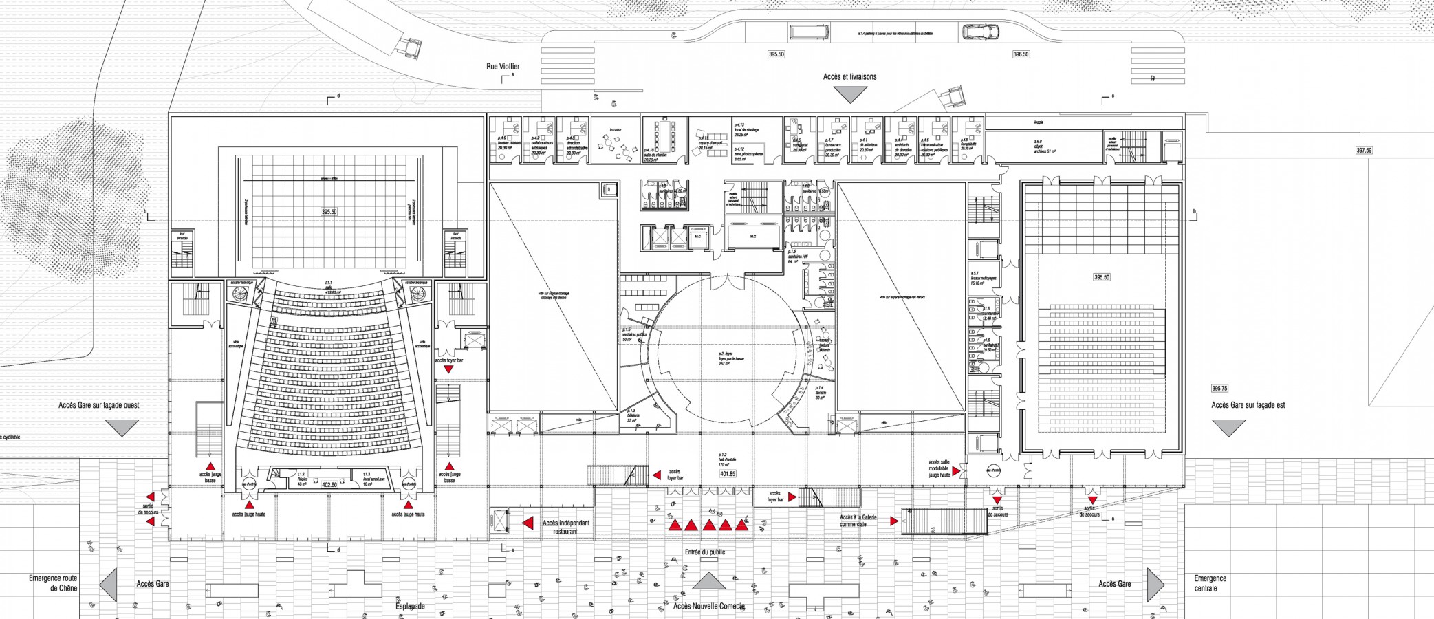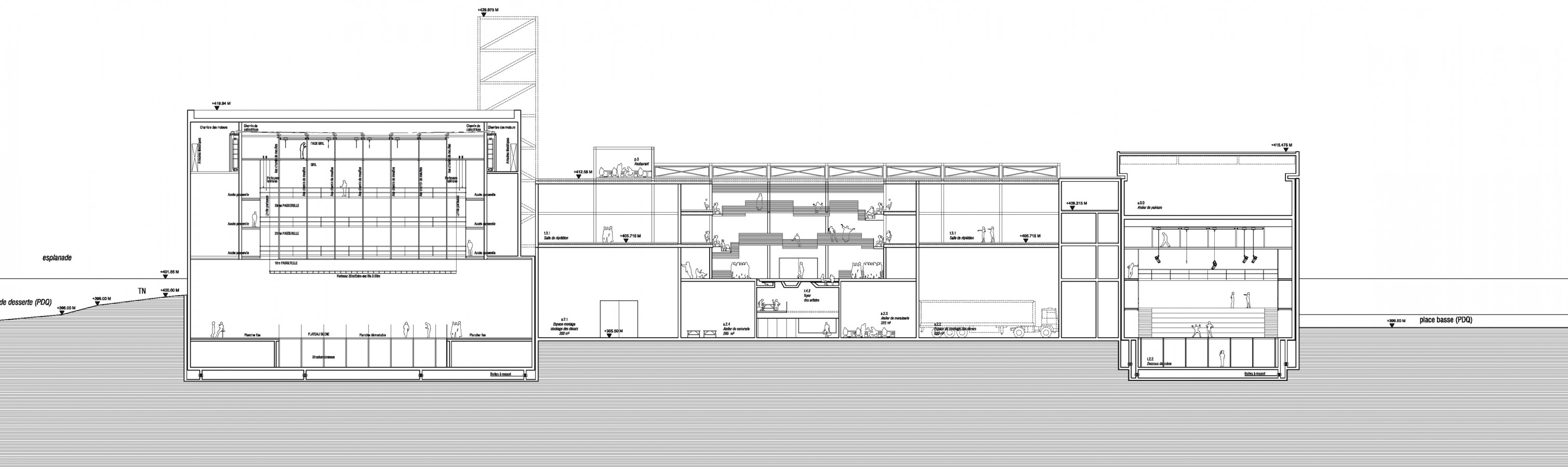 An enormous show machine, successful and functional. As a theater with entrails returned towards the outside, with its flies, its rails, its footbridges, a whole open-air machinery. The building is a continuous grid which used by art to express itself: the building on the entertainment’s service. The wooden structure hangs on the concrete shell which structures both rooms, studios and rooms for repetitions to assure the constraints of heat and acoustic insulation. All the fluids will be visible, integrated into the wooden scaffold, as in a factory. The New Comedy wants to be a «platform of shows» which opens towards the city with its esplanade, towards the sky with its Elizabethan foyer, and eastward with the multi-purpose room opened on the low square.