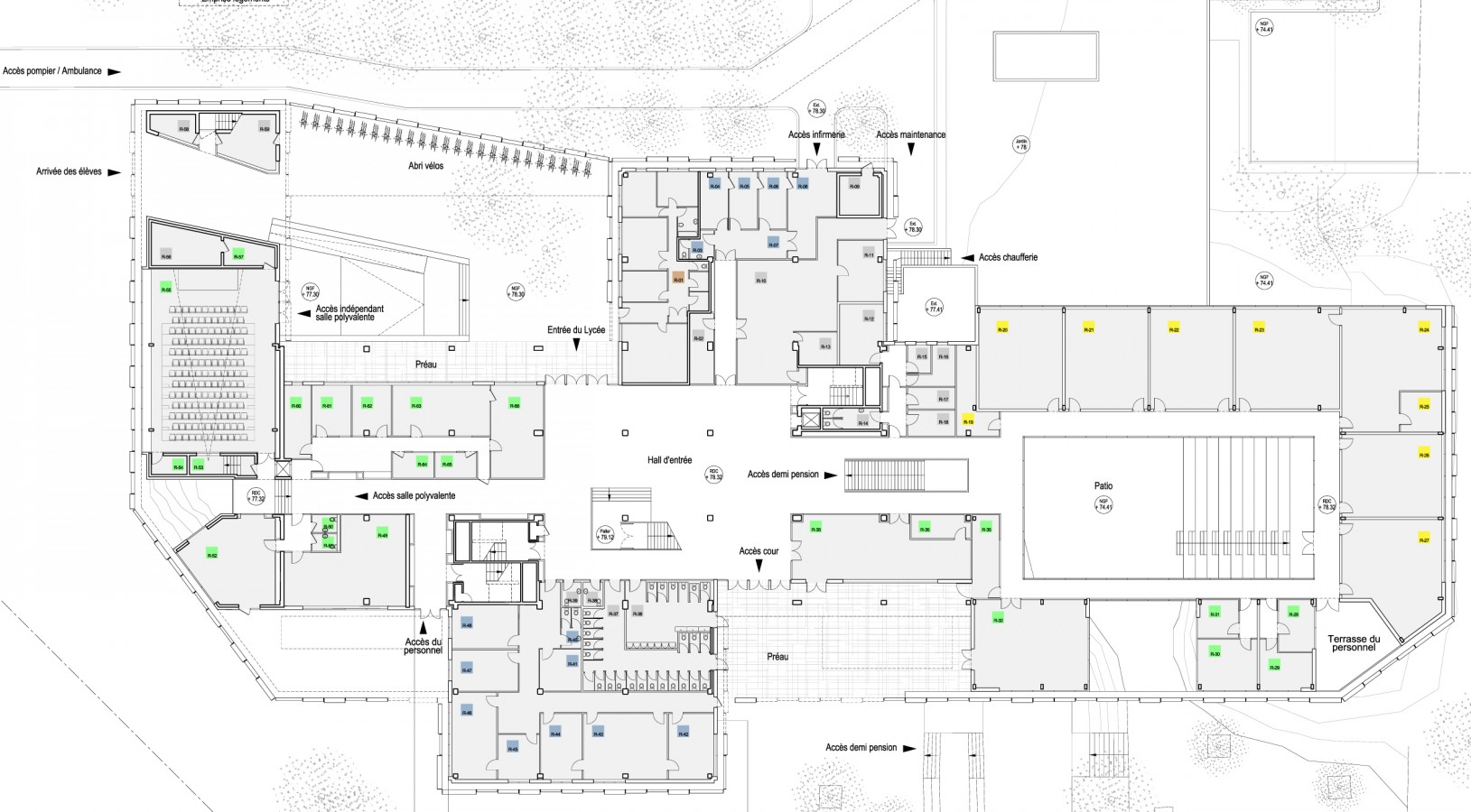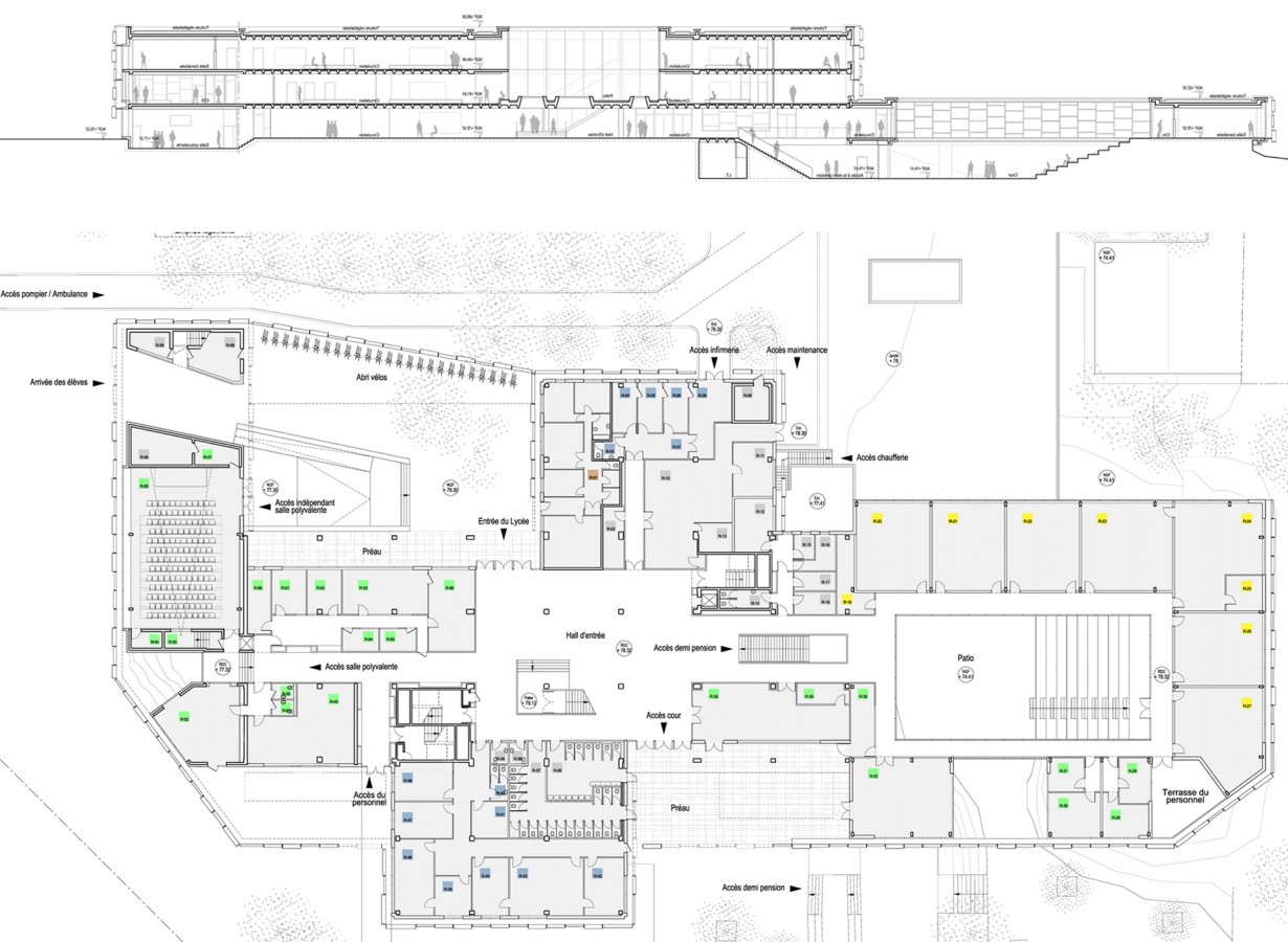 We consider the existing building as a huge tired and too heavy machine in its integration in the site. At the same time, this building presents a certain rigor, about its structure and of its proportions. We appreciate this rigor which allowed us to size the buildings of the extension. The constraint of a phasing in busy site, and especially the will to give to the pupils and to the professors the envy to take possession of their new High school, guided all the conception of the project while preserving almost totality of the existing building with the exception of the striking part of the low ground floor. This extension develops westward and eastward. Westward to signpost the high school since the street J. Ferry, eastward to have north-south directed classes.