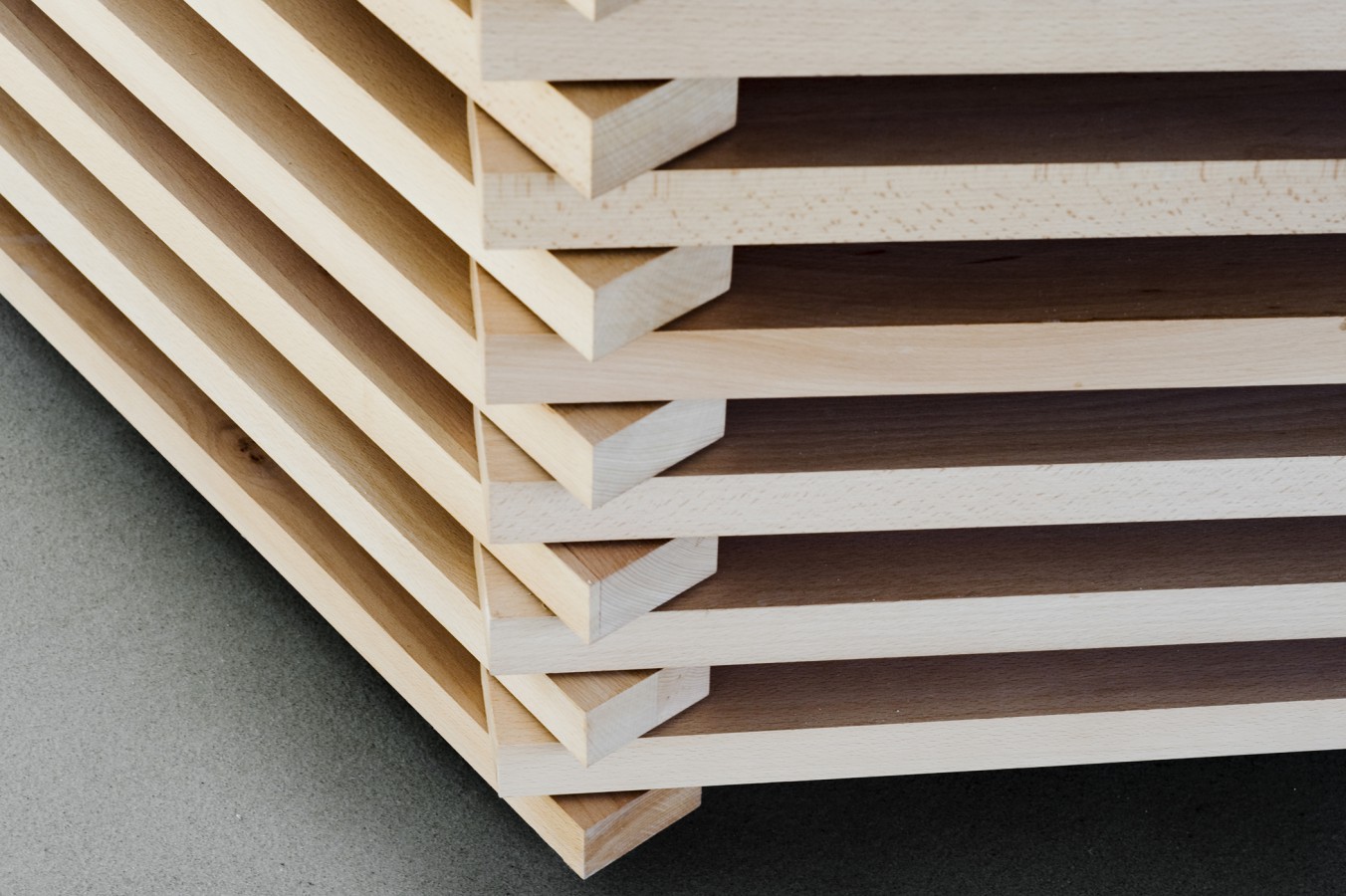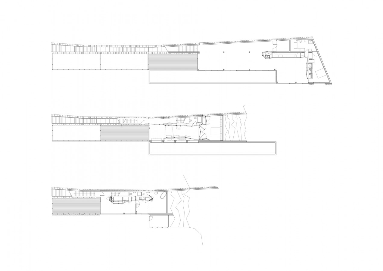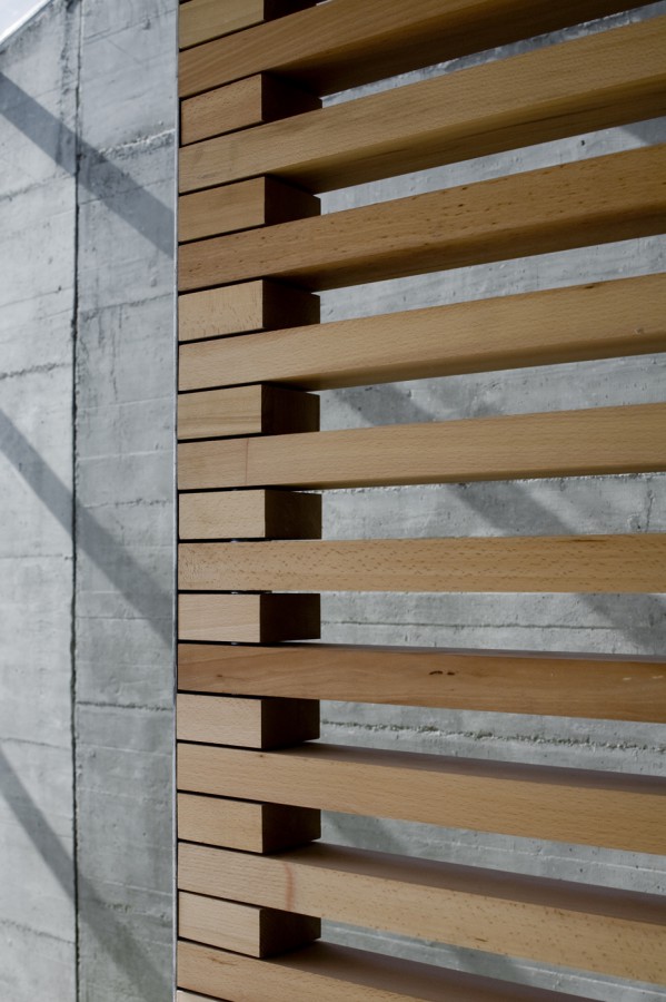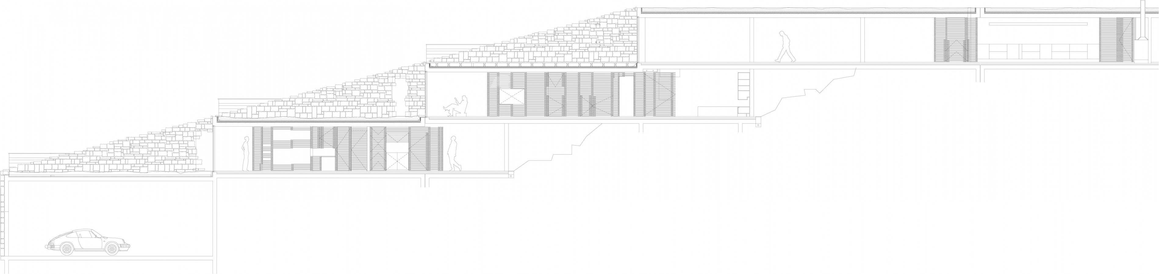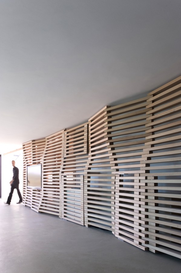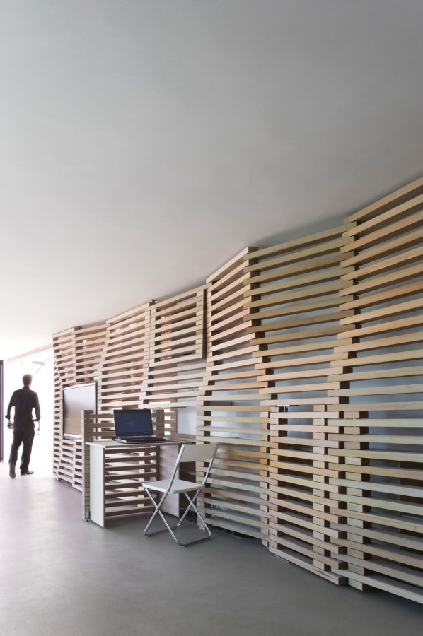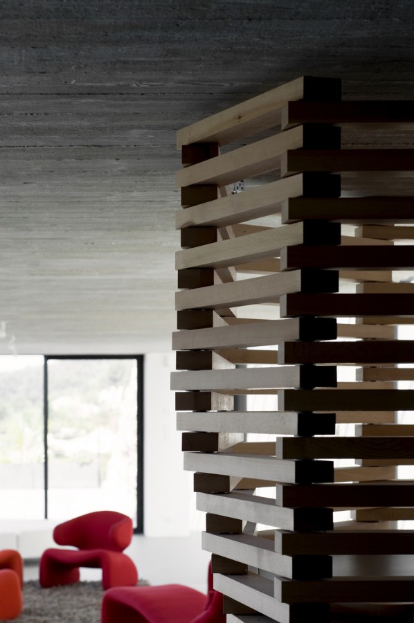 Intervention on a Rudy Ricciotti villa in Bandol in the Var in which light and water are ever-present. The villa expands on three tangling levels because of adopting the shape of the roc on which it has been built. A 30 meter length swimming pool follows the facade of the higher level. The interior design reminds the presence of the roc takings shapes of wooden sculptures at each level of the villa. Every function of the interior spaces are handled by an openwork wooden panel which, composed of about 1700 modules of three different lengths, lays out the three levels of the house on more than 300m² integrating cupboards, tables, beds, a desk, bathrooms, small kitchens and so on. The distortion is owed to slight differences in the assemblage of the pieces of wood.