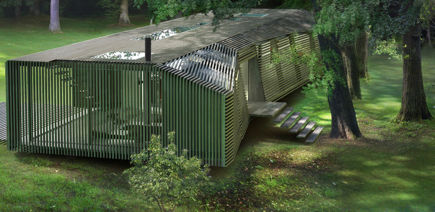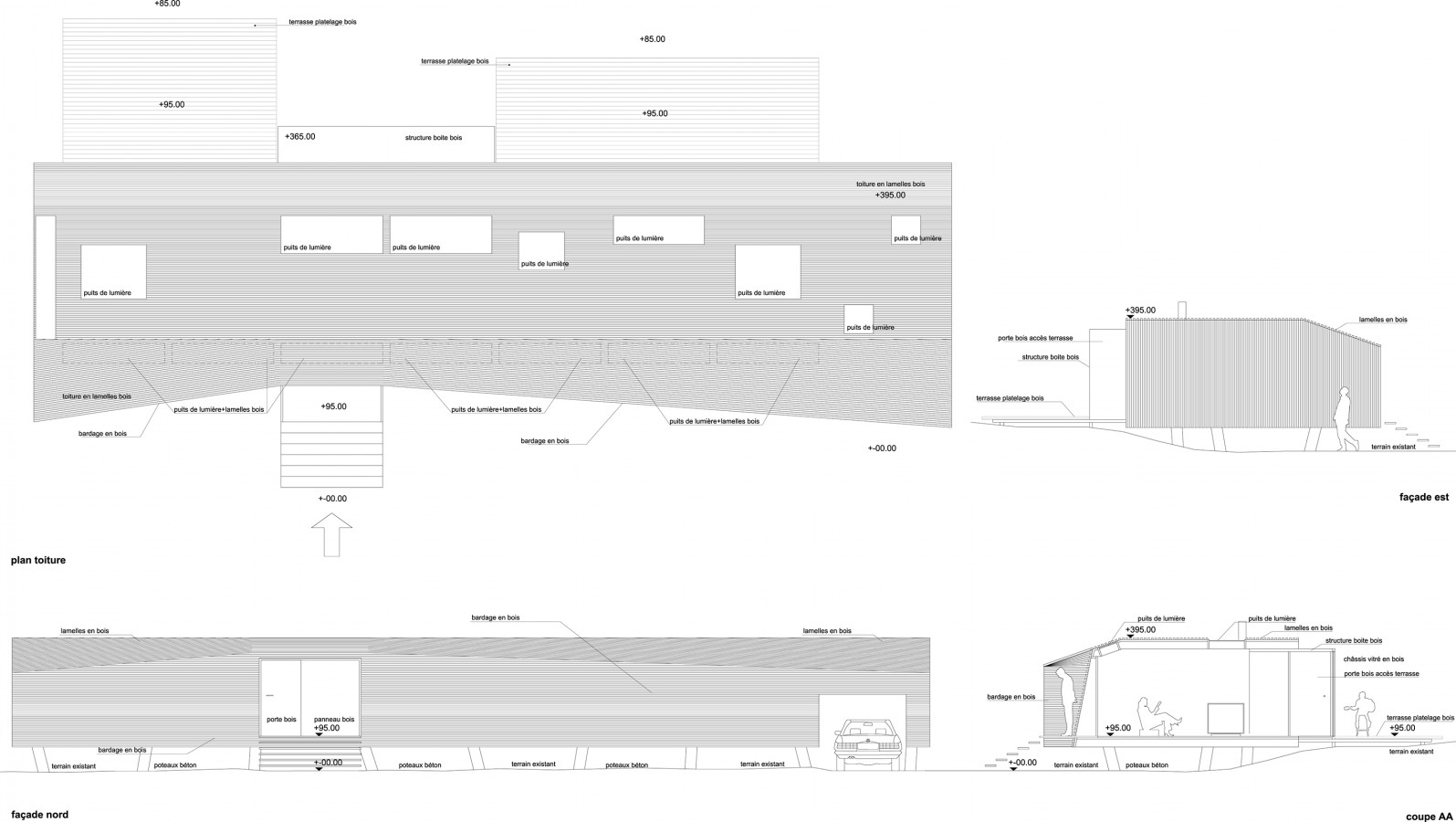 The house is located in a wooded area on the edge of a forest in the Hauts de Seine Department, and raises its height of the ground to respect trees and their roots. Since the arrival, the facade and the roof, developed as a continuum, both wood cladded, could seem as a small hill hidden in the undergrowth.